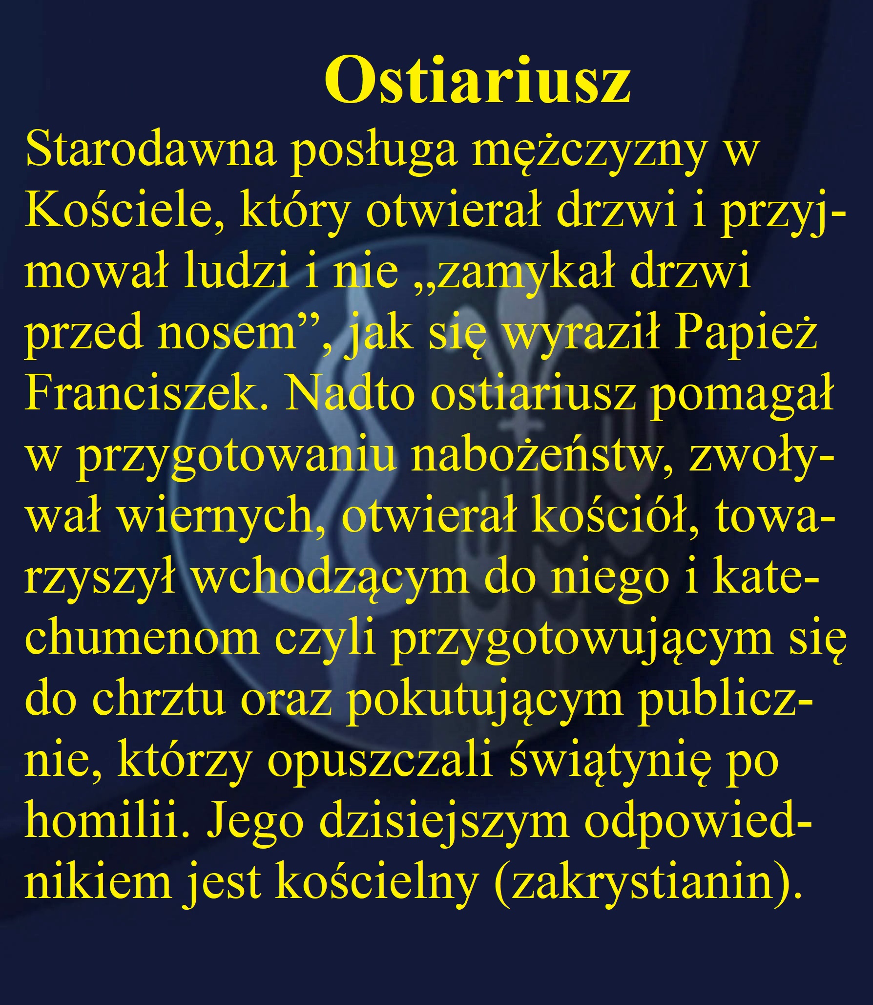 Ostiariusze czuwający u wejścia do kościoła mieli wiele pracy. Oprócz zwyczajnego przyjmowania przybywających zajmowali się dzieciakami. Zbierano je w specjalnej salce, ale one bardzo często uciekały z tego pomieszczenia i powracały do kościoła. Podbiegały do ołtarza otoczonego ministrantami, których liczba w pewnym momencie dochodziła do setki, i patrzyły zachwycone z otwartymi buziami, podobne do rybek z kolędy tam śpiewanej: „Ale popatrz sam, jak piją, jak piją ryby w rzece, ale popatrz sam, jak piją, bo widzą Boże Dziecię...”.